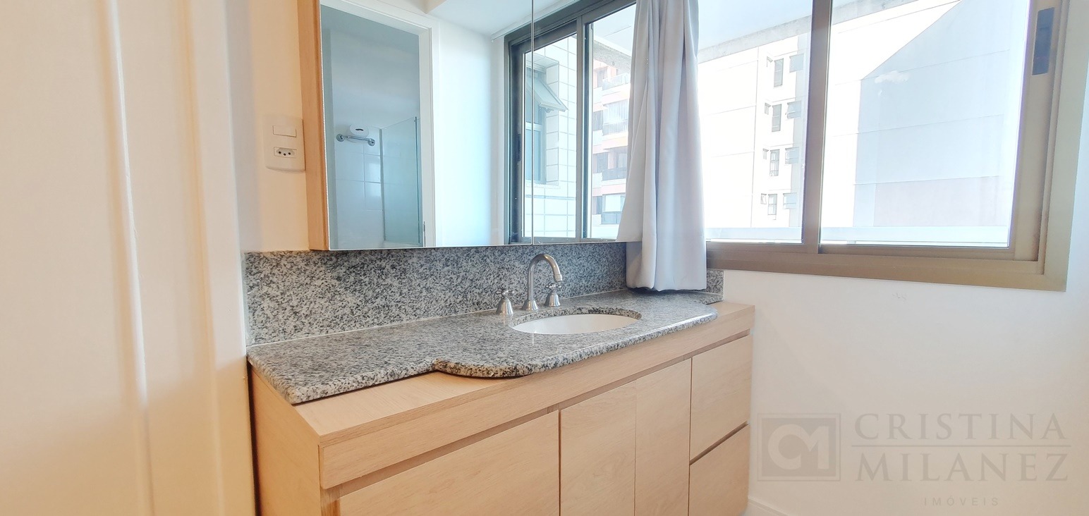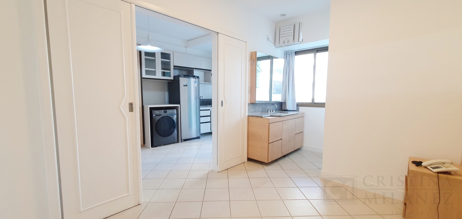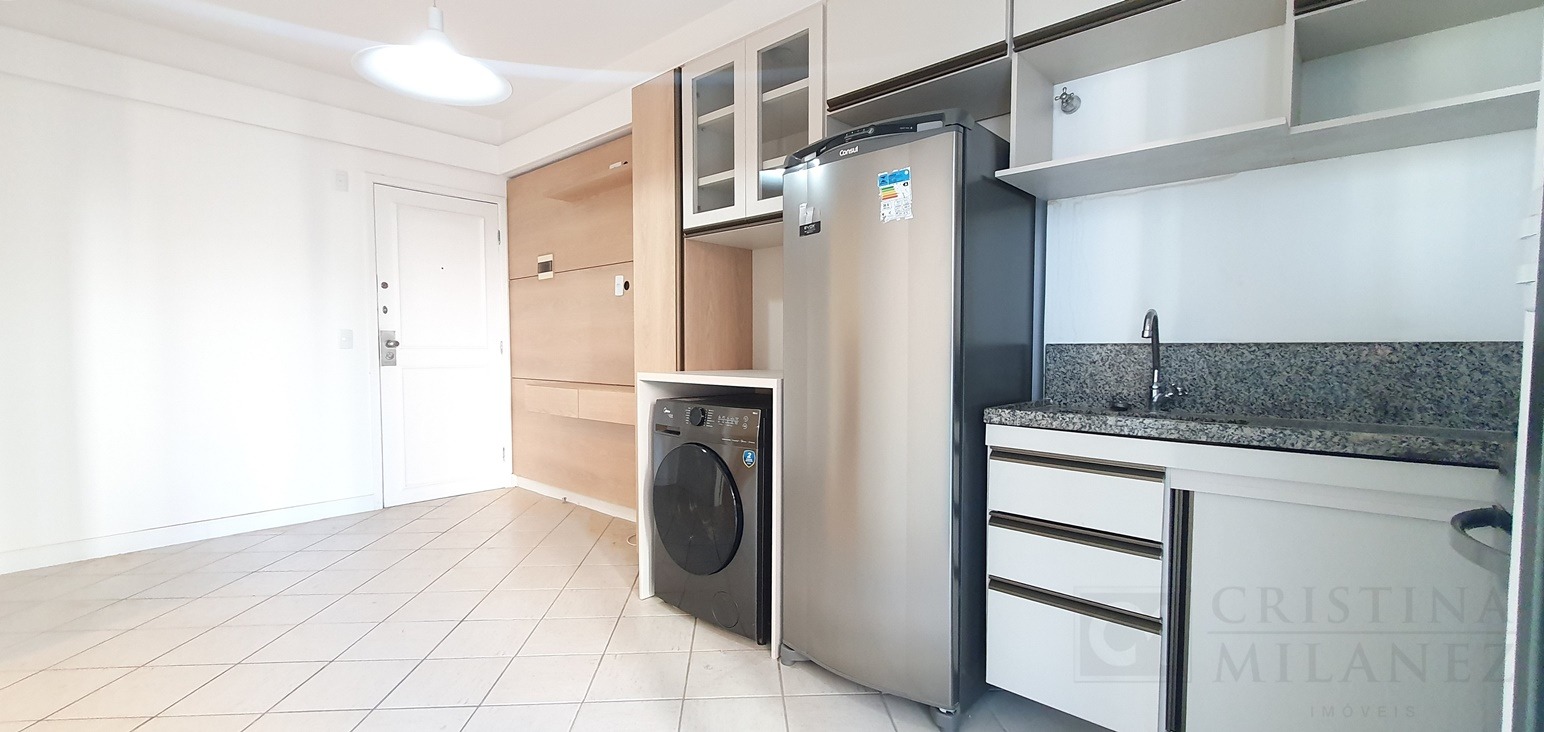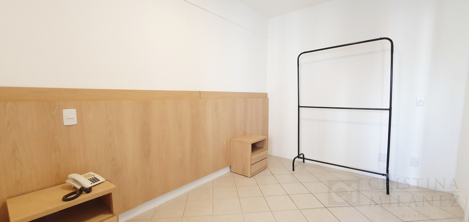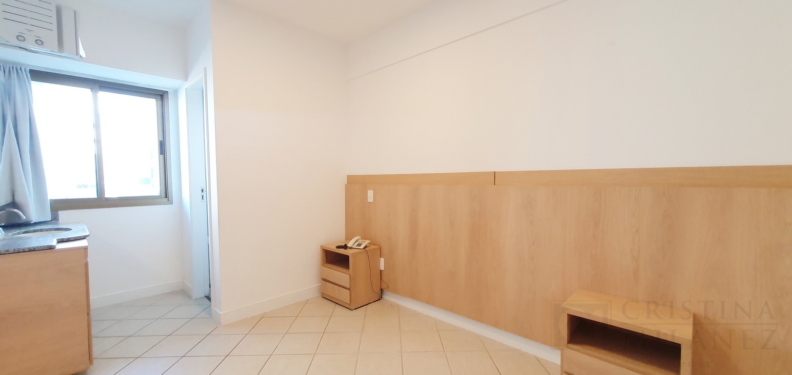 O apartamento lateral com vista para o mar no 7º andar, sol da manhã, possui 1 quarto, sala, varanda, banheiro e cozinha.