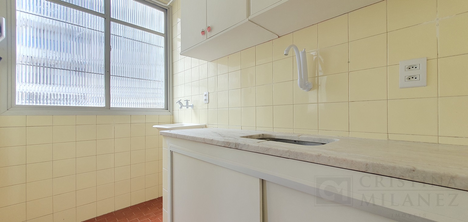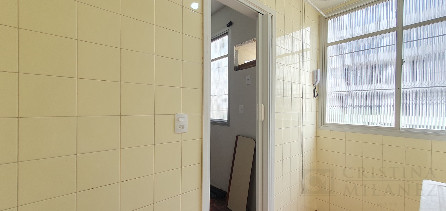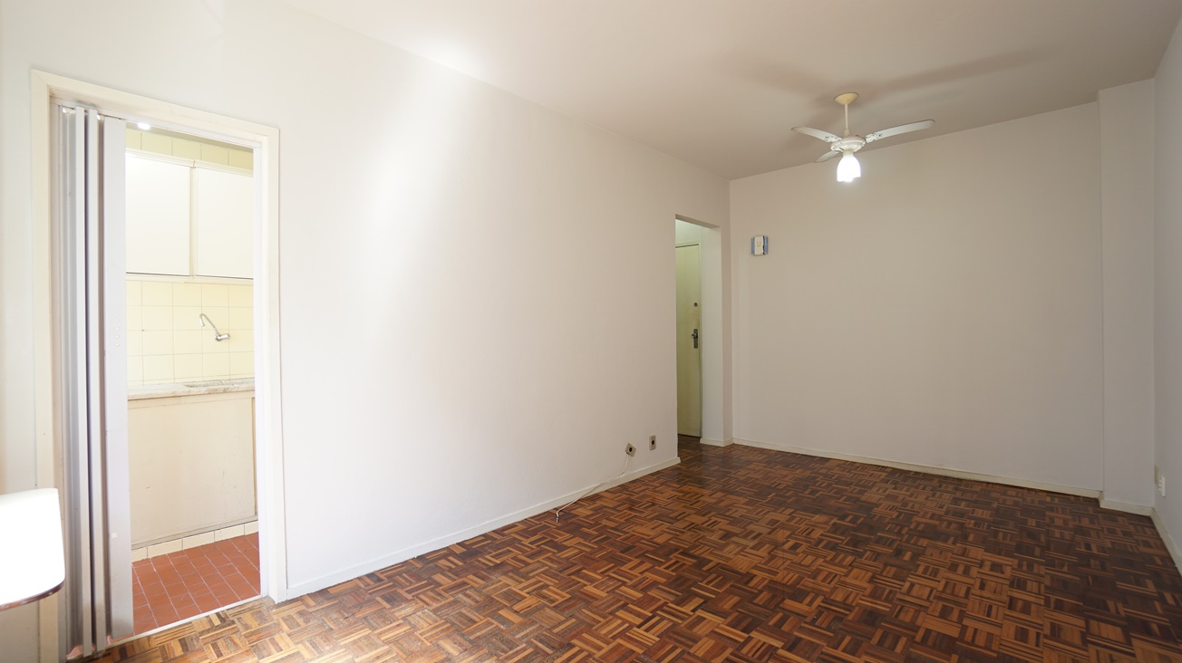 O apartamento de frente no 1º andar, sol da manhã, possui quarto e sala conjugados, banheiro social, cozinha e área de serviço.