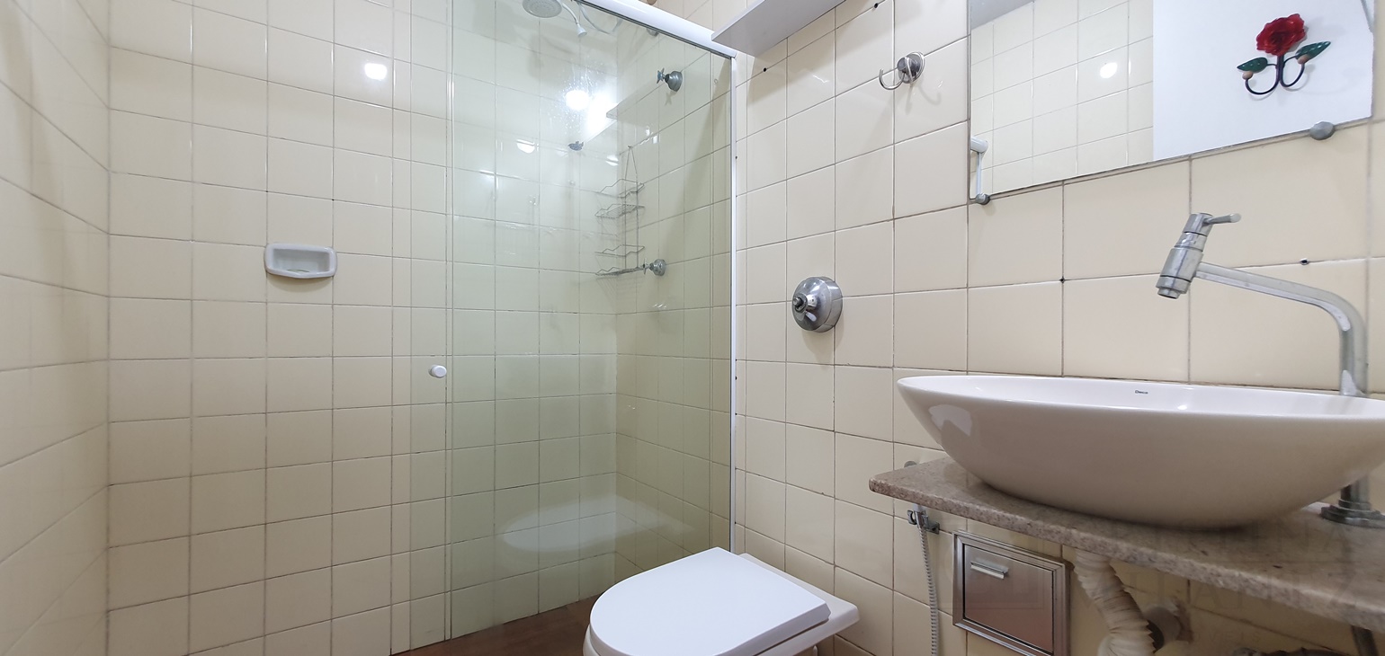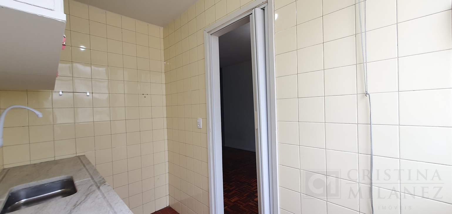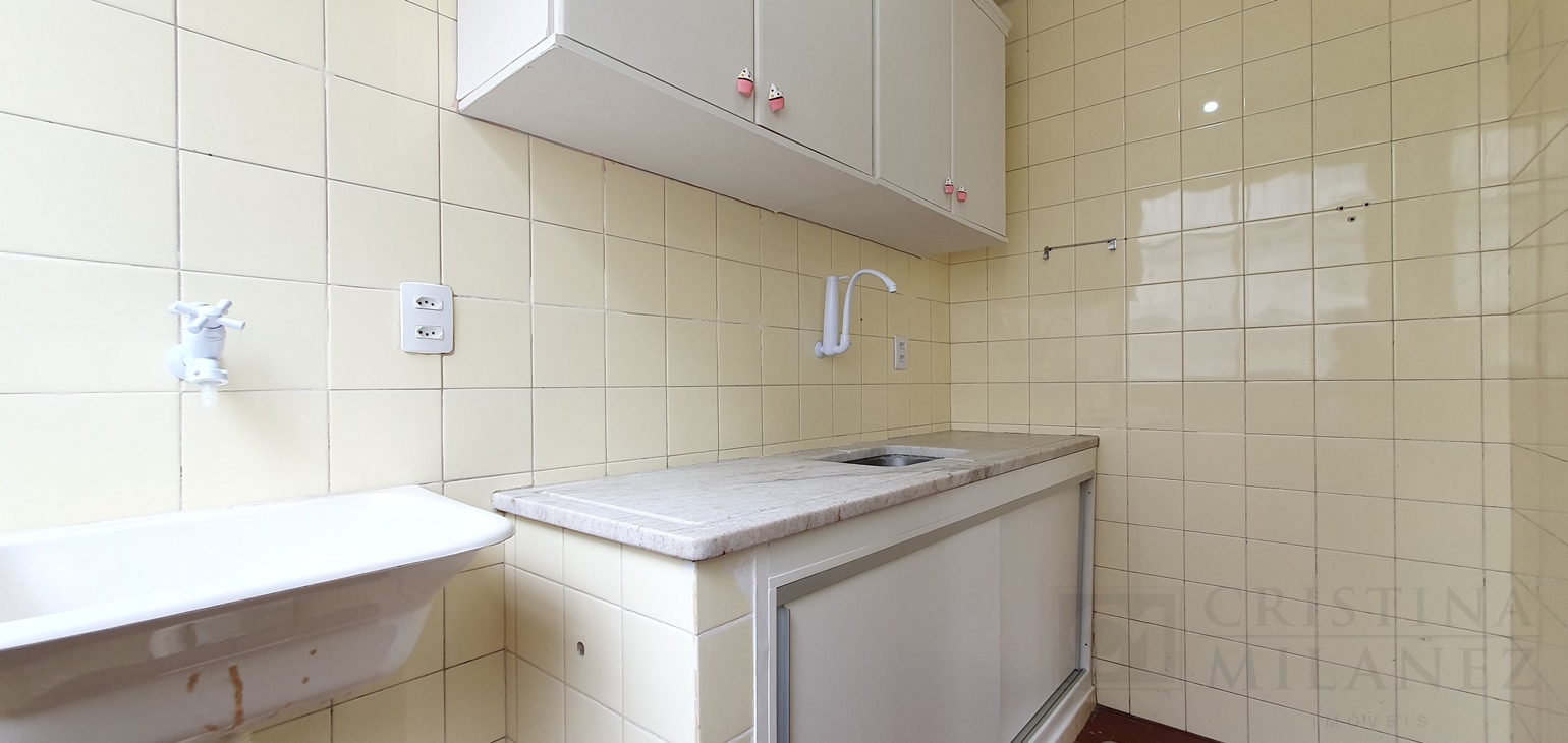 O apartamento de frente no 1º andar, sol da manhã, possui quarto e sala conjugados, banheiro social, cozinha e área de serviço.