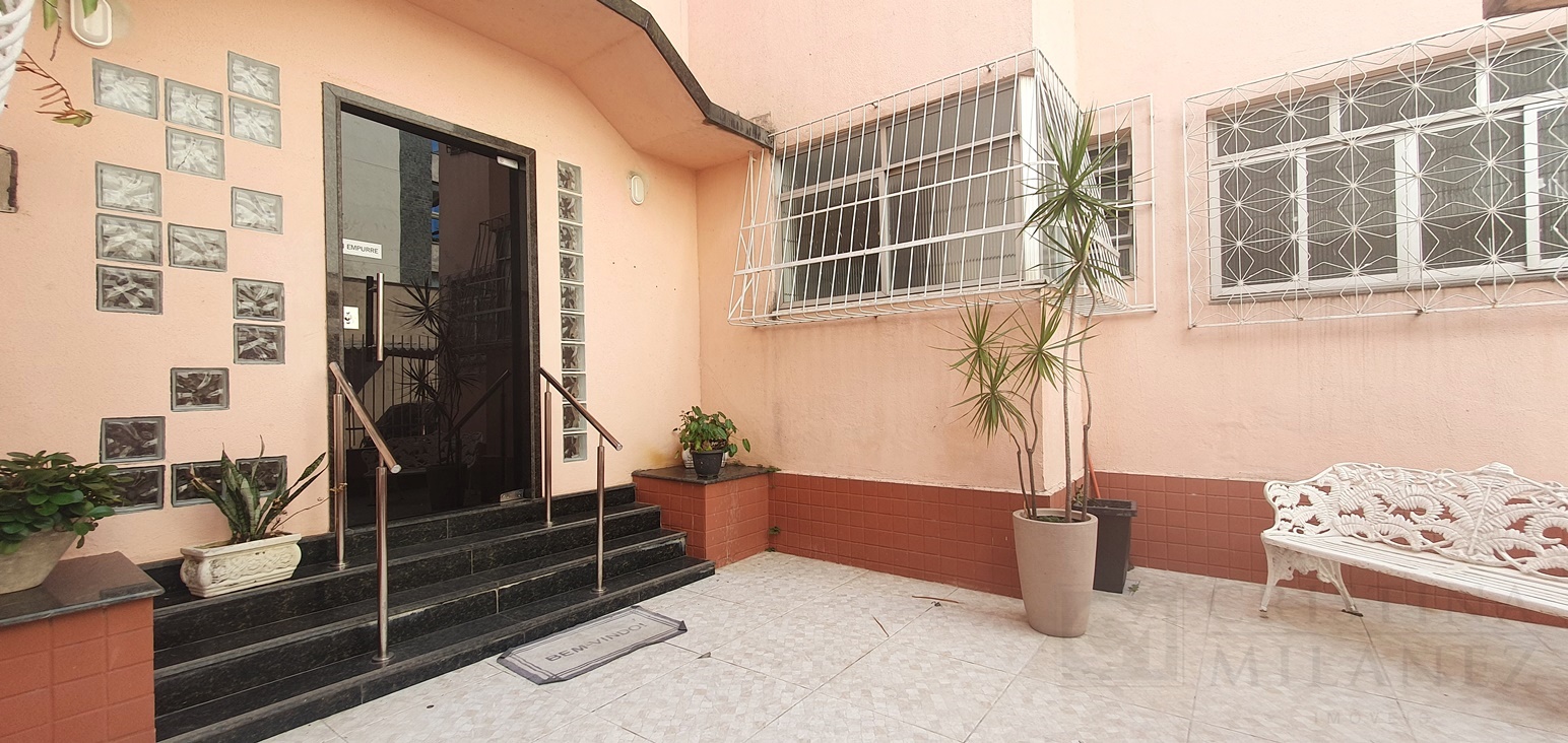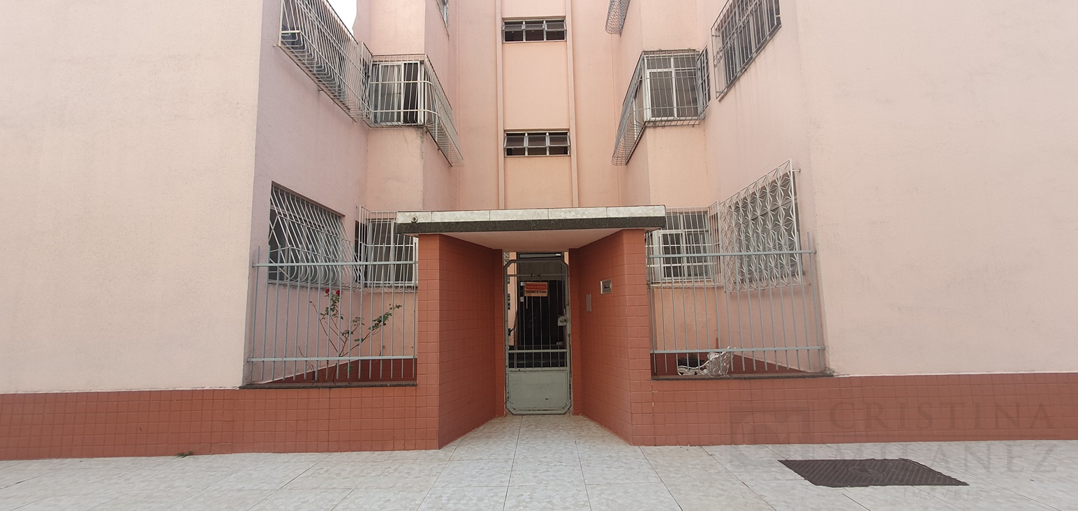 O condomínio oferece área de convivência, portão eletrônico e zeladora.